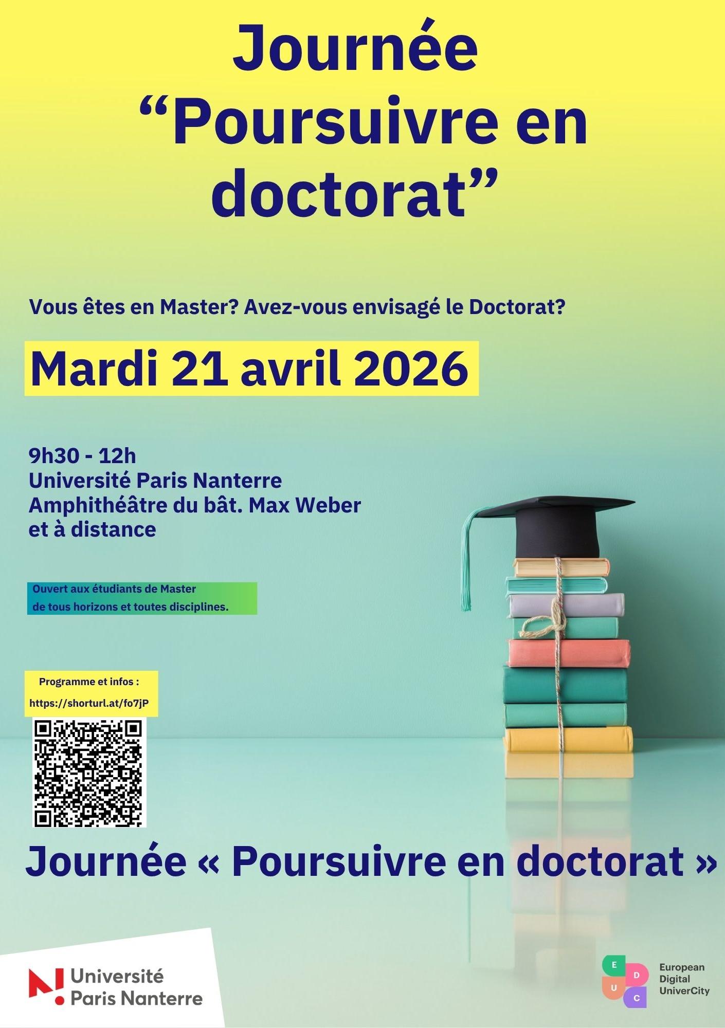 Mardi 21 avril de 9h30 à 12h, l’Université Paris Nanterre organise un événement spécialement conçu à l'attention des étudiantes et des étudiants actuellement en Master et qui souhaitent obtenir toutes les informations nécessaires pour une poursuite d'étude en Doctorat.